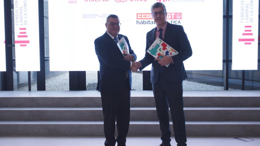 El director general de Fundación ONCE, y vicepresidente de Inserta Empleo, José Luis Martínez Donoso, y el director general de la Fundación Laboral de la Construcción, Julio Gil Iglesias, han firmado este miercoles, 13 de diciembre, un convenio para fomentar el empleo y la formación de las personas con discapacidad, así como la accesibilidad universal.
