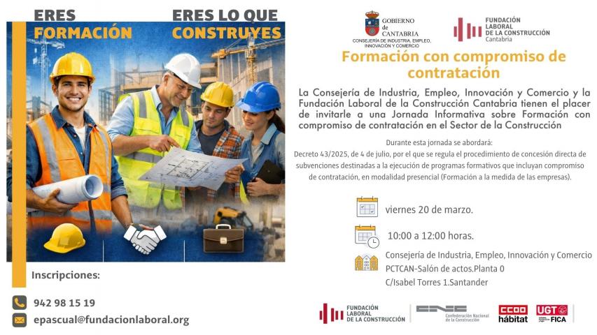 La Consejería de Industria, Empleo, Innovación y Comercio de Cantabria, en colaboración con la Fundación Laboral de la Construcción de Cantabria, celebrará una jornada informativa centrada en la “Formación con compromiso de contratación”, una iniciativa orientada a fortalecer el empleo en el sector de la construcción.
