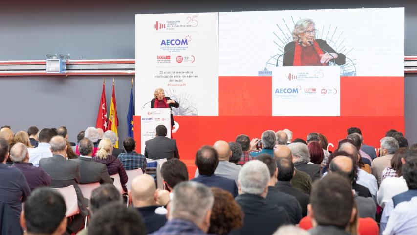 Durante su intervención en la clausura del acto, Manuela Carmena alabó la labor desarrollada por la Fundación Laboral de la Construcción y la evolución del propio sector de la construcción, el cual describió como un sector “esencial para las ciudades” y, en concreto, para la ciudad de Madrid: “Madrid es una ciudad histórica y nueva, que en 60 años se ha quintuplicado; tenemos una buena construcción, con buenas viviendas, con las que el 85% de los ciudadanos están satisfechos por ser de buena construcción”, valoró Carmena. La regidora también calificó al sector de ‘mágico’: “De un solar luego vemos viviendas, escuelas y centros de mayores, y eso hace que desde el arquitecto al albañil sea una actividad mágica”, elogió la alcaldesa.