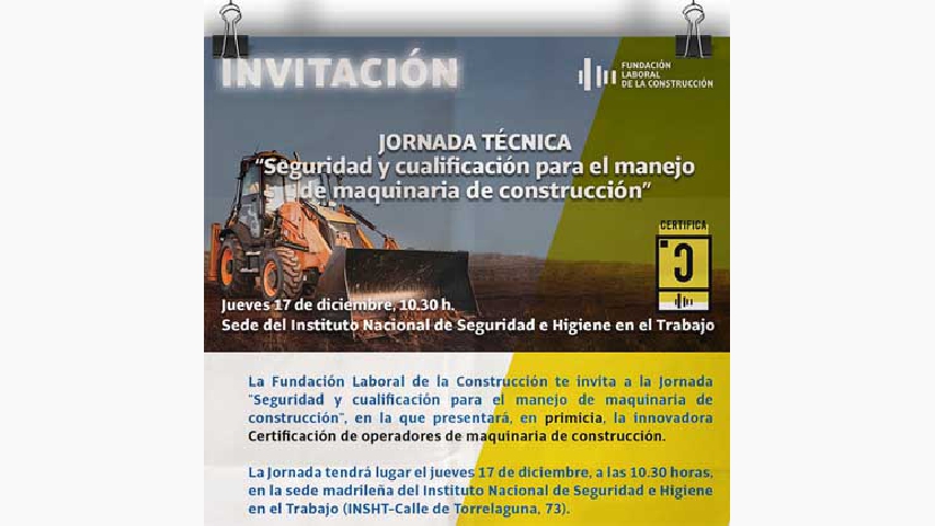 La Fundación Laboral de la Construcción celebrará el próximo jueves 17 de diciembre, a las 10.30 horas, una Jornada técnica bajo el título "Seguridad y cualificación para el manejo de maquinaria de construcción", que tendrá lugar en la sede madrileña del Instituto Nacional de Seguridad e Higiene en el Trabajo (INSHT-Calle de Torrelaguna, 73), y en la que presentará, en primicia, la novedosa “Certificación de operadores de maquinaria de construcción”.