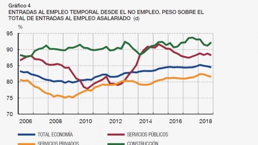 Si bien la temporalidad se ha mantenido a lo largo de los últimos años en niveles más altos que en el periodo pre-crisis en las cinco grandes ramas de actividad analizadas (agricultura, industria, construcción, servicios públicos y servicios privados), el organismo hace especial hincapié en “la resistencia a la baja en la temporalidad” en el sector de la construcción. En este sentido, el informe indica que la tasa de entrada al empleo temporal desde el no empleo (trabajadores parados e inactivos), en la construcción se ha mantenido por encima del 90% prácticamente desde el año 2007. Es decir, más del 90% de los trabajadores que acceden al mercado laboral a través de la construcción, lo hace con un contrato temporal.